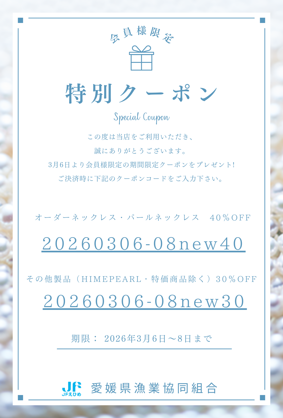 発行を行います。えひめ真珠サイト内でもお得にお買い物をお楽しみください。